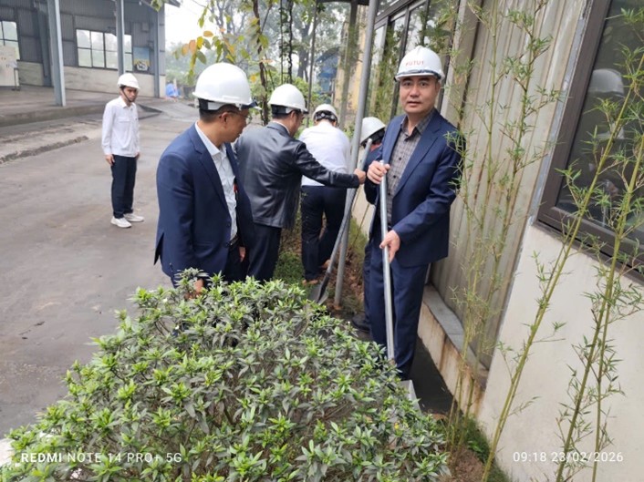 Đ/c Ngô Anh Tuấn, Trợ lý GĐ và đ/c Nguyễn Thanh Bình, Phó CTCĐ công ty và các đồng chí lãnh đạo xưởng Đúc chụp ảnh lưu niệm tại địa điểm trồng cây.