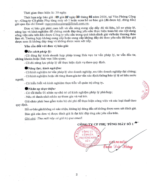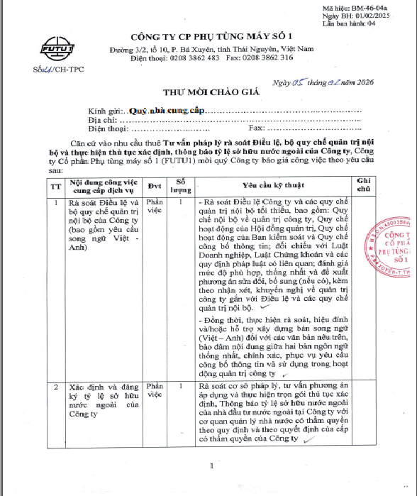 Futu1 gửi thư mời chào giá nhu cầu thuê tư vấn pháp lý rà soát Điều lệ, bộ quy chế quản trị nội bộ và thực hiện thủ tục xác định, thông báo tỷ lệ sở hữu nước ngoài của Công ty.